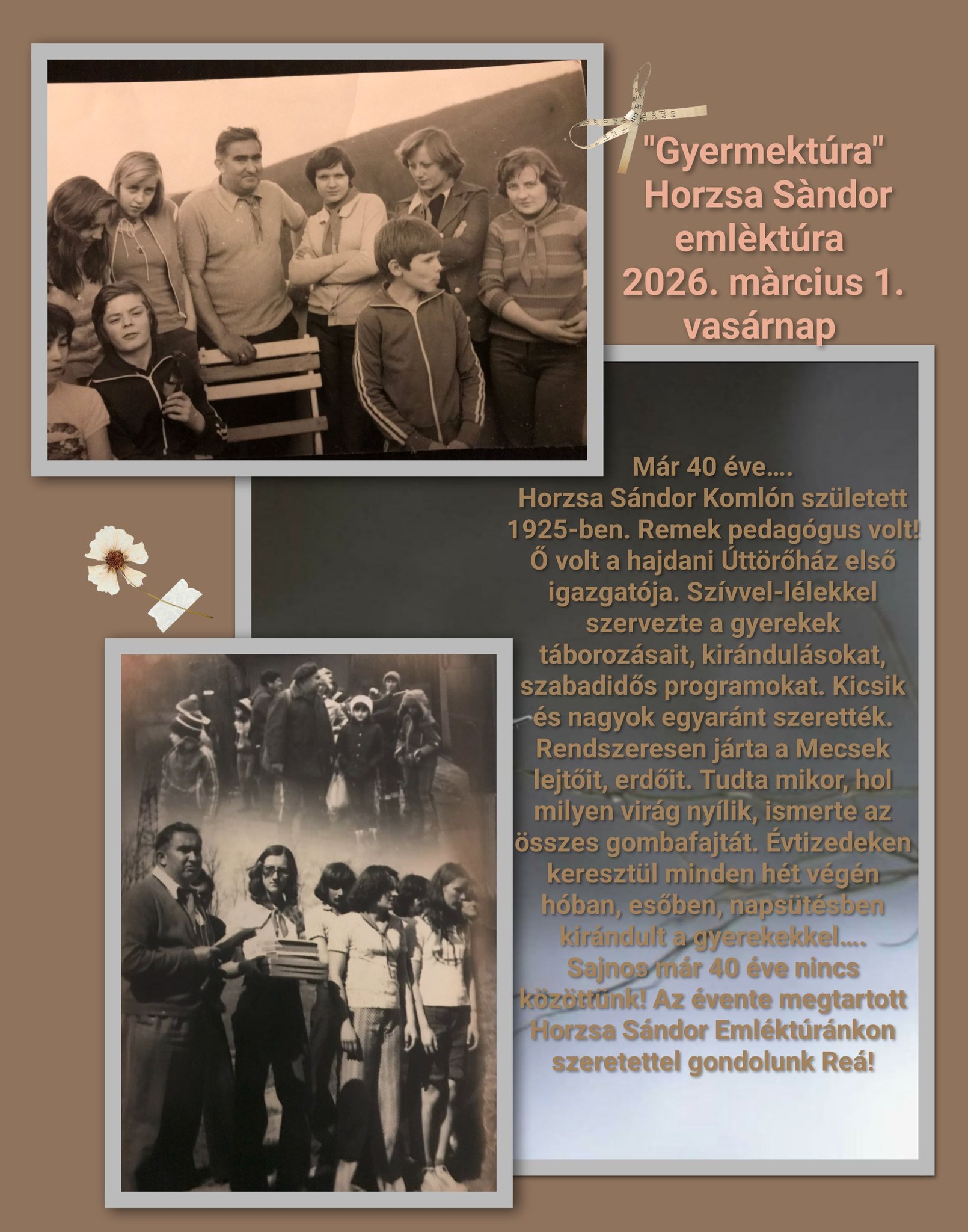 Útvonal: Màrè csàrda -Vörösfenyő kulcsoshàz-Kata -forràs- Vörösfenyő kulcsoshàz -Gerda -forràs- Màrè csàrda Indulás Komlóról a 7:40-es mekènyesi járattal. Túravezető: Papp Luca Panna